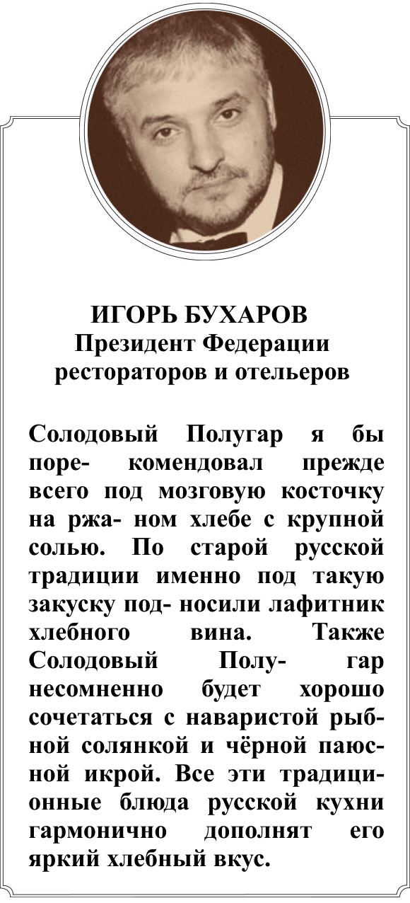 Солодовый Полугар – вершина русского дворянского искусства дистилляции, подлинный шедевр хлебного вкуса и аромата, производимый всегда лично самим Борисом Родионовым в медных перегонных кубах, здесь и соложение отборной ржи, и традиционная технология трехкратной перегонки в медных аламбиках. При второй перегонке отсекается наиболее значительное количество «голов» и «хвостов» и оставляется только хлебное «сердце» дистиллята. Далее следует дорогостоящая очистка свежим яичным белком куриных яиц, длительный настой на березовом угле и месячный «отдых», когда благородные дистилляты из ржаного солода смешиваются, неторопливо формируя свой неповторимый насыщенный хлебный букет. Солодовый Полугар разлит в копию полуштофа Елизаветы Петровны 1745 года объемом 0,615 л. В дорогой подарочной упаковке вы найдете интереснейшую книгу по истории российского винокурения «Полугар. Возрождение» на ста страницах.